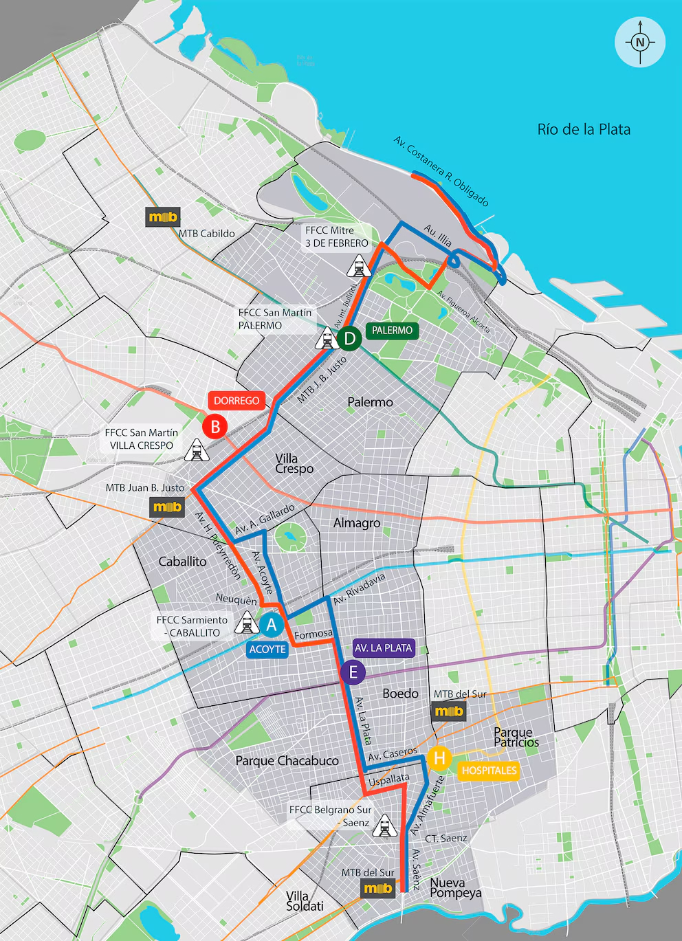 - En Caballito tendrá conexión con las estaciones Acoyte y Río de Janeiro de la Línea A de subte y cercanía con Estación Caballito (FFCC Sarmiento).