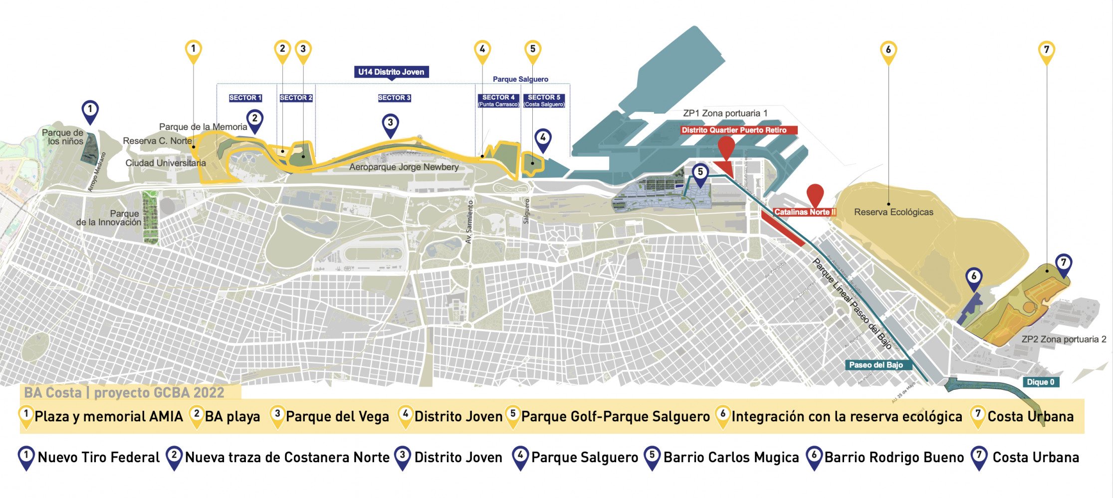 6) Reserva Costanera Sur. Inclusión de un nuevo puente de acceso peatonal, pasarelas y mobiliario urbano, para ampliar los accesos a las 350 ha de esta reserva que en 2005 fue declarada como sitio Ramsar por su importancia mundial como humedal. Incluye también nuevas áreas de servicios comerciales a licitar, en tanto áreas de descanso dentro de la Reserva. Este espacio fue inaugurado en septiembre de 2023.