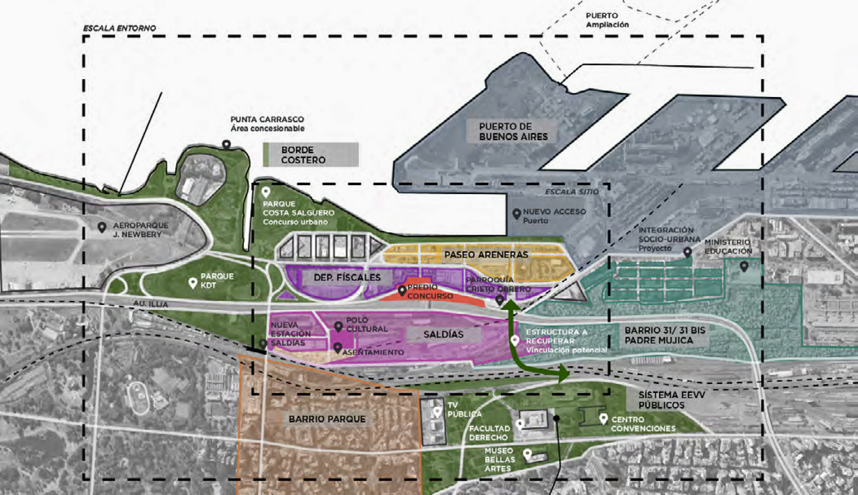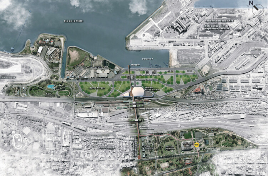El proyecto ganador plantea una visión metropolitana en un nuevo modo de reconectar la ciudad con la costa del río. Desde esa perspectiva, suma por un lado superficie verde y paisaje a un área de la ciudad, y por el otro promueve la incorporación de actividades culturales (teatro, cine, centro de convenciones, centro cultural, museos, entre otros) y espacios recreativos, junto con usos deportivos, comerciales o de servicios. Desde esos lineamientos, genera propuesta a varias escalas. Considerado la pieza en sí se puede mencionar la integración del área desde Dársena F del puerto al sector de areneras y depósitos de contenedores y, más ampliamente, establece lineamientos para su articulación en orientación norte, sur y oeste, reforzando el rol de la pieza que es objeto de proyecto.