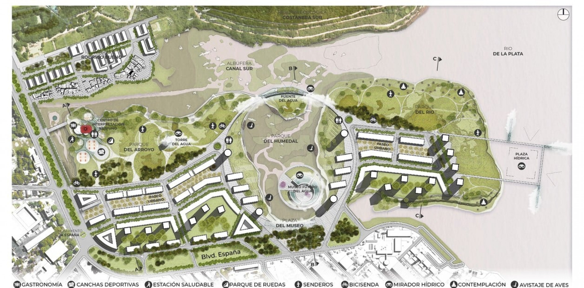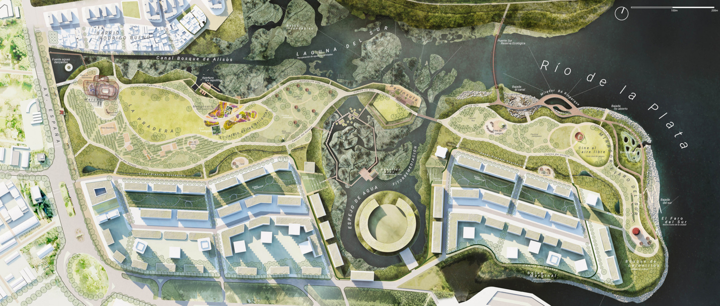 En esa dirección, BA Río Parque, el proyecto ganador, se enfoca en revalorizar características existentes, recuperar reliquias significativas del parque, celebrar la biodiversidad local e implementar iniciativas de restauración ecológica. Se propone un parque público estructurado a partir de un paseo peatonal de aproximadamente 2.000 m de largo, que inicia en Av. España y termina sobre la costa del Río de la Plata frente a la Reserva Ecológica, rodeando las torres.